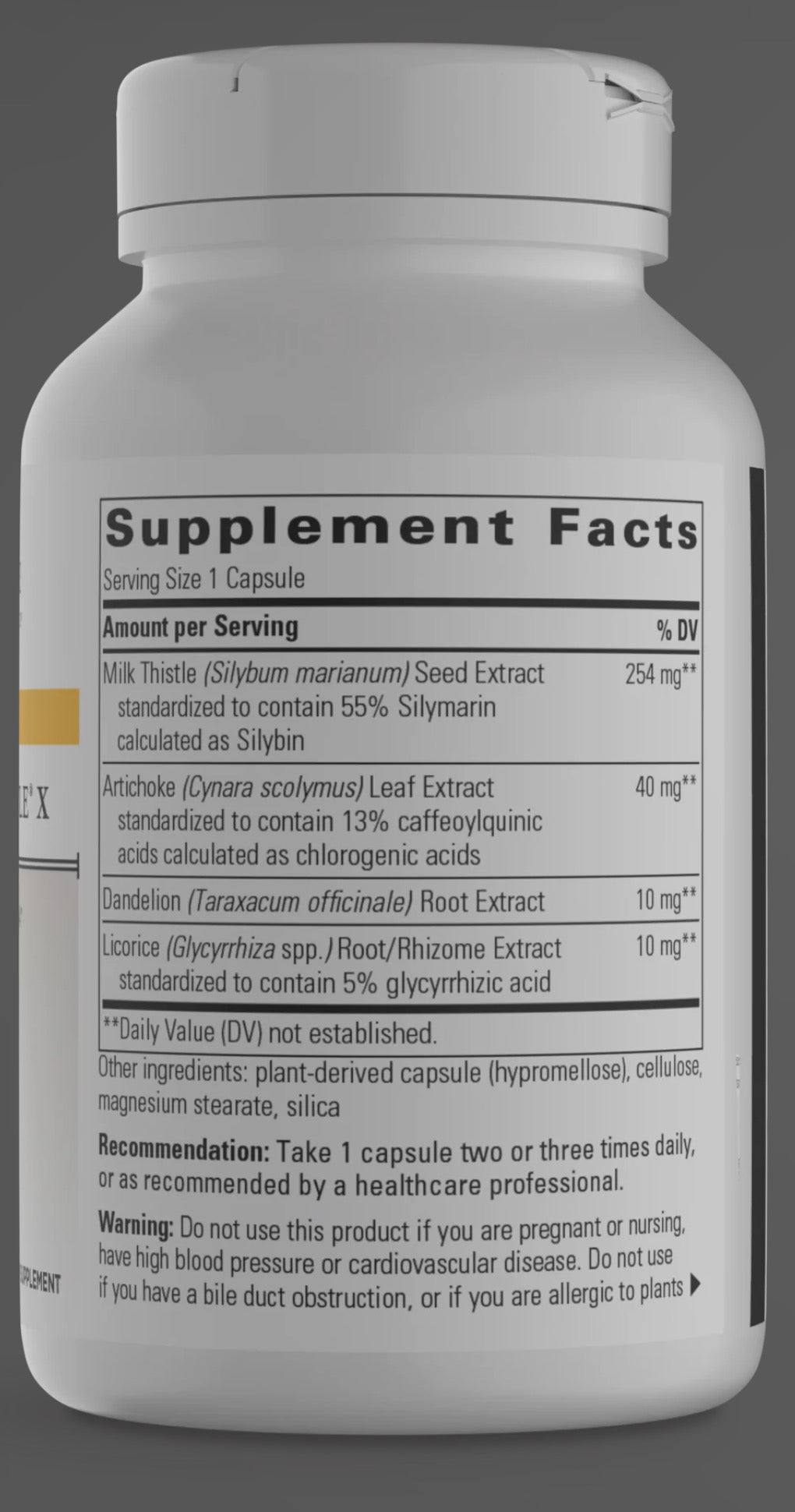 Milk thistle (Silybum marianum) extract with other supportive herbs for healthy liver support.* Super Milk Thistle X combines artichoke extract, dandelion leaf extract, and licorice root extract with a milk thistle fruit extract, standardized to contain 55% silymarin.